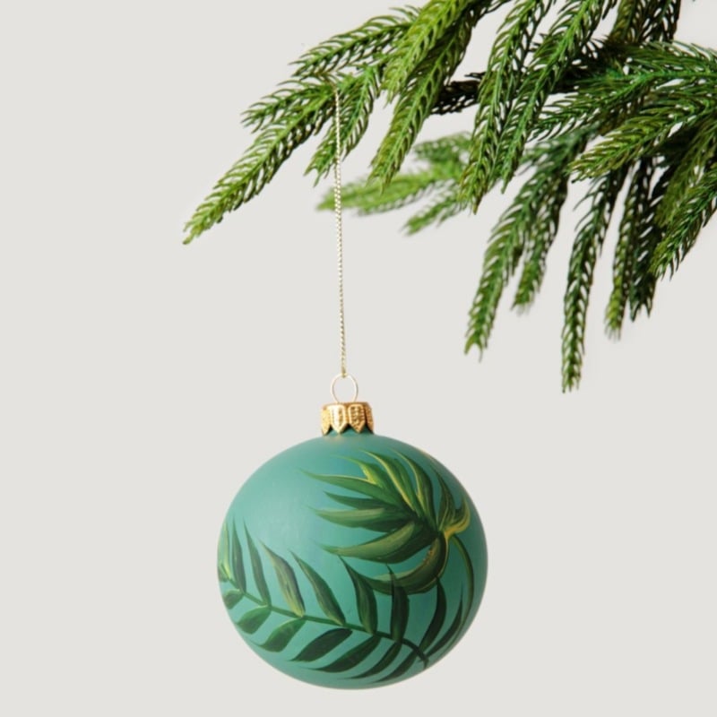 Hand painted green palm leaf glass ornament